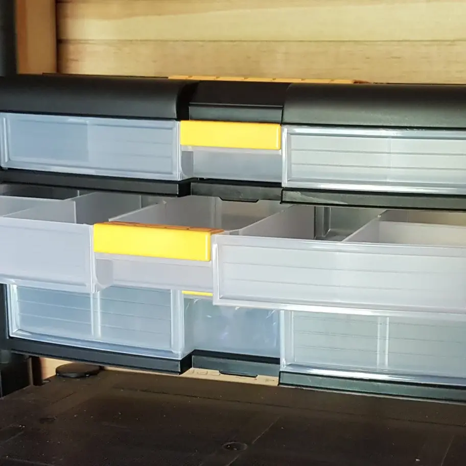 Two drawers (35mm high each) fitted with six fixed dividers for organizing small components.